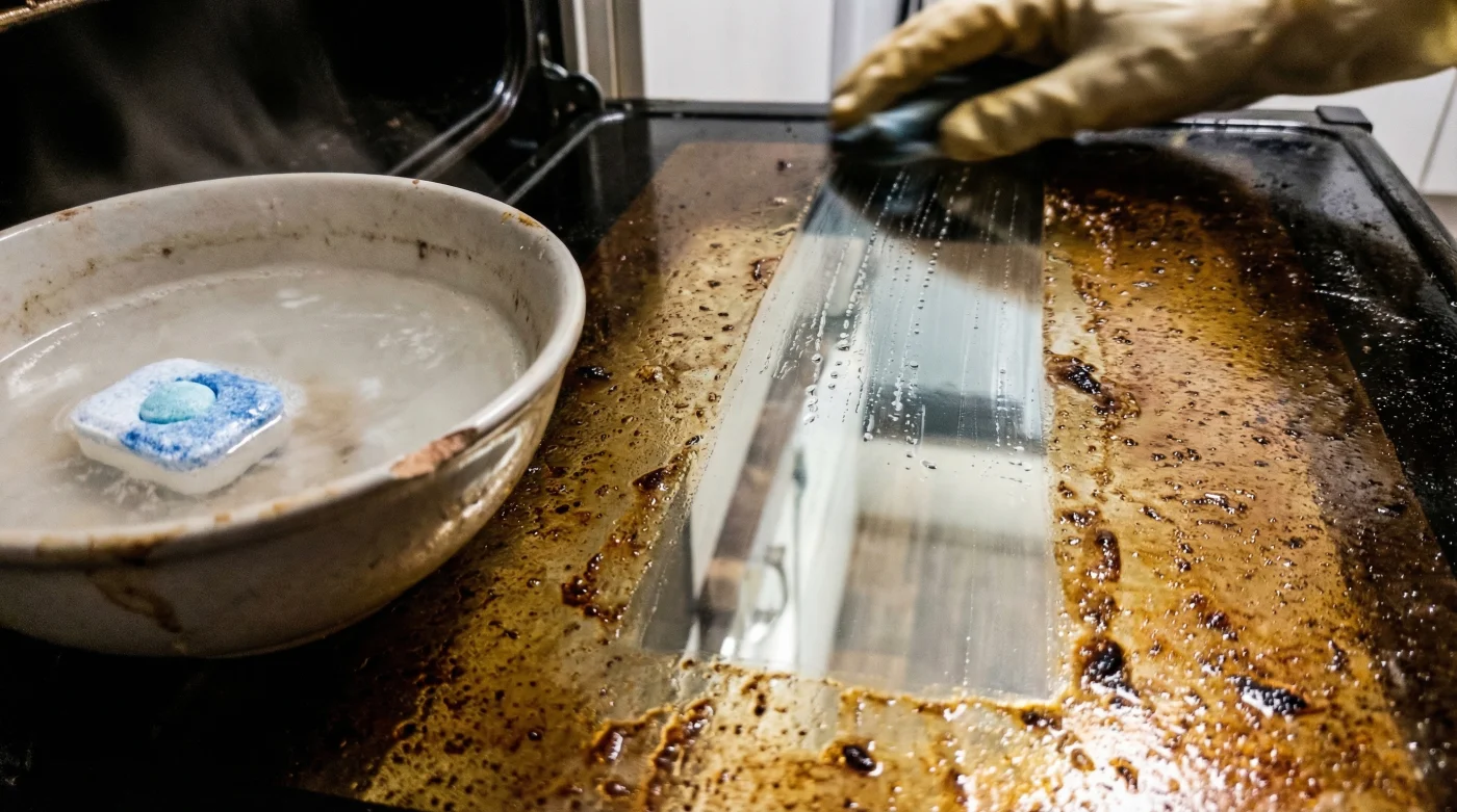 Öncelikle fırınınızı 40 Santigrat derecede sadece 5 dakika çalıştırıp kapatın. Bu hafif ılımanlık ortamı, donmuş yağların yumuşamaya başlaması için ilk kimyasal sinyali verir. Isıya dayanıklı geniş bir kaseye 1 su bardağı kaynar su (yaklaşık 90 Santigrat derece) koyun ve içine 1 adet klasik bulaşık makinesi tableti bırakın. Suyun enzimler için ideal olan 60 Santigrat seviyesine inmesi ve tabletin eriyerek yoğun bir macun kıvamına gelmesi için birkaç dakika bekleyin.